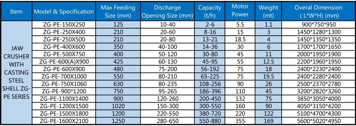 Main TechnicaI Data of Jaw Crusher ZG—PE Series: