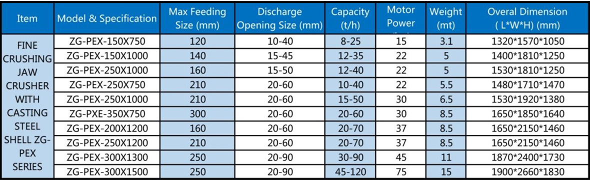Main TechnicaI Data of Jaw Crusher ZG—PEX Series: