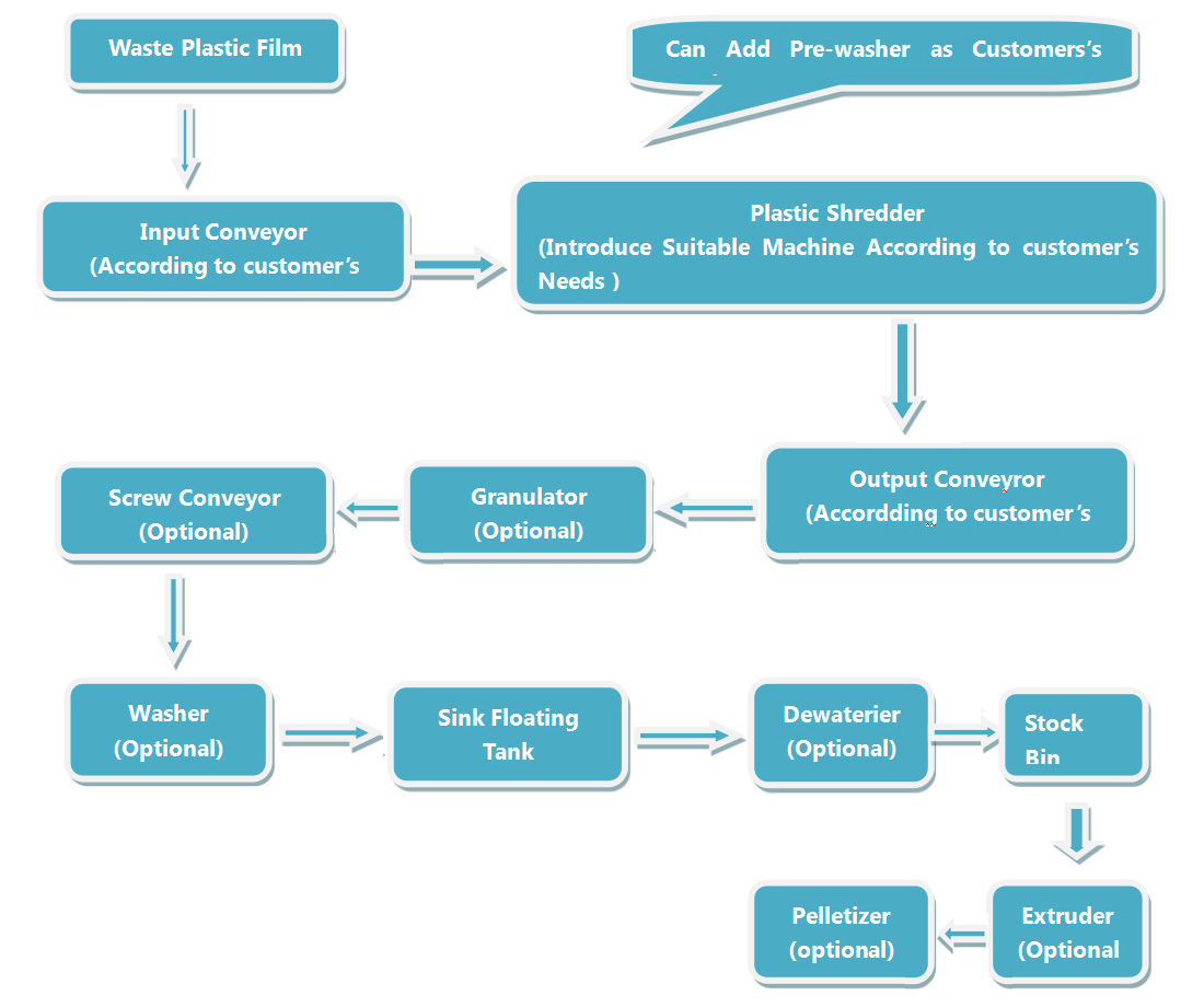 This processing diagram is used for the waste plastic film shredding, washing, dewatering and pelletzing.. It can be adjusted according to customers’ actual condition.