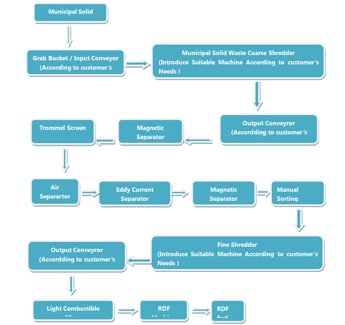 This processing diagram is used for the municipal solid waste through crush, sort, to RDF. It is adjustable according to customers’ actual condition. .